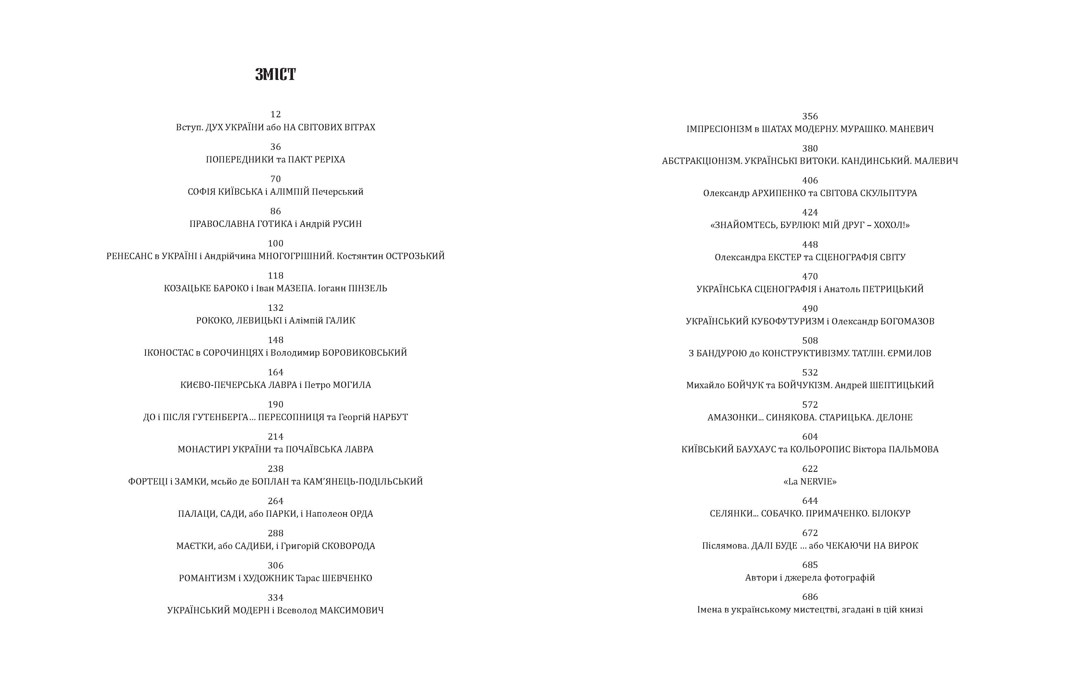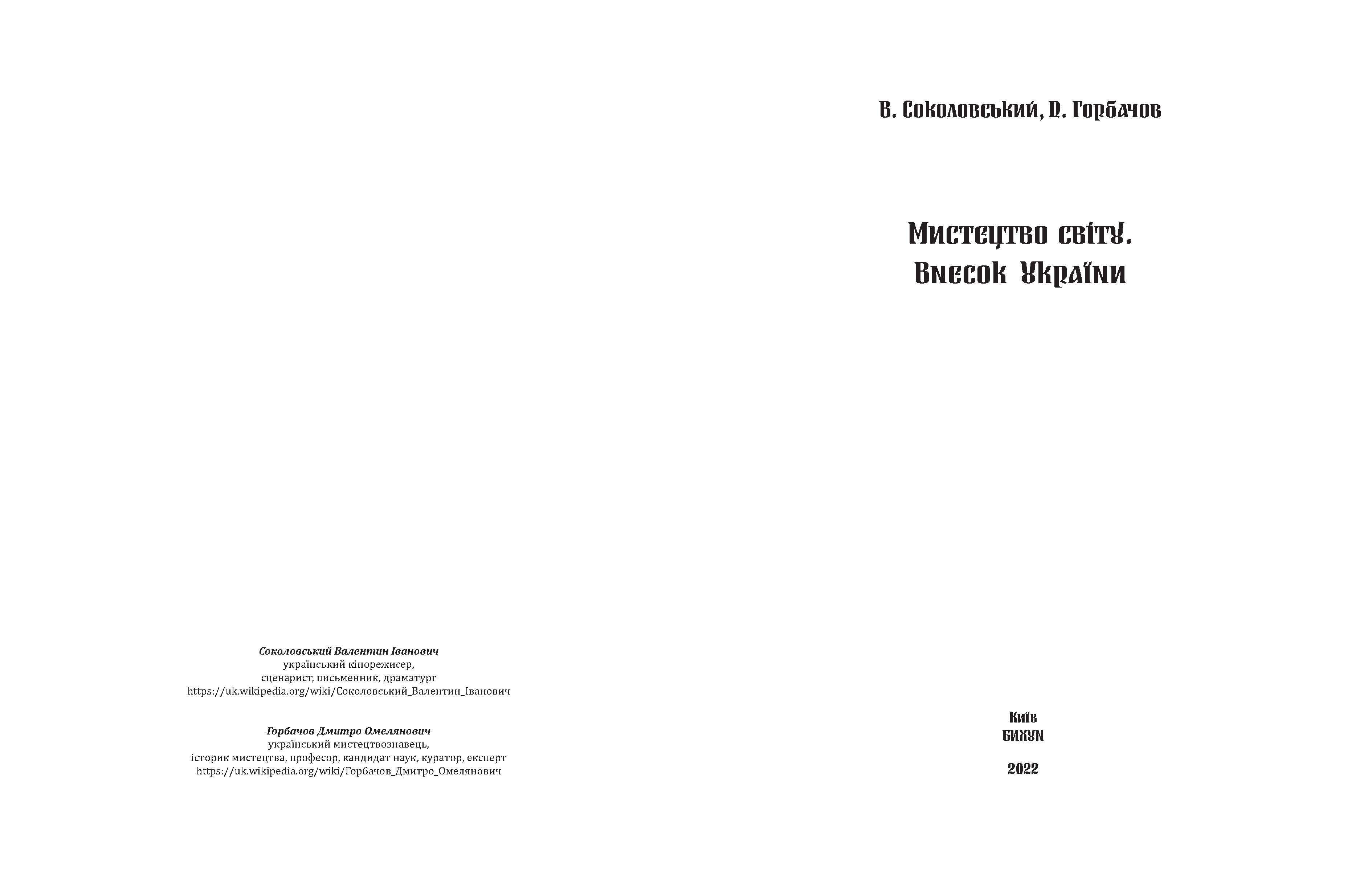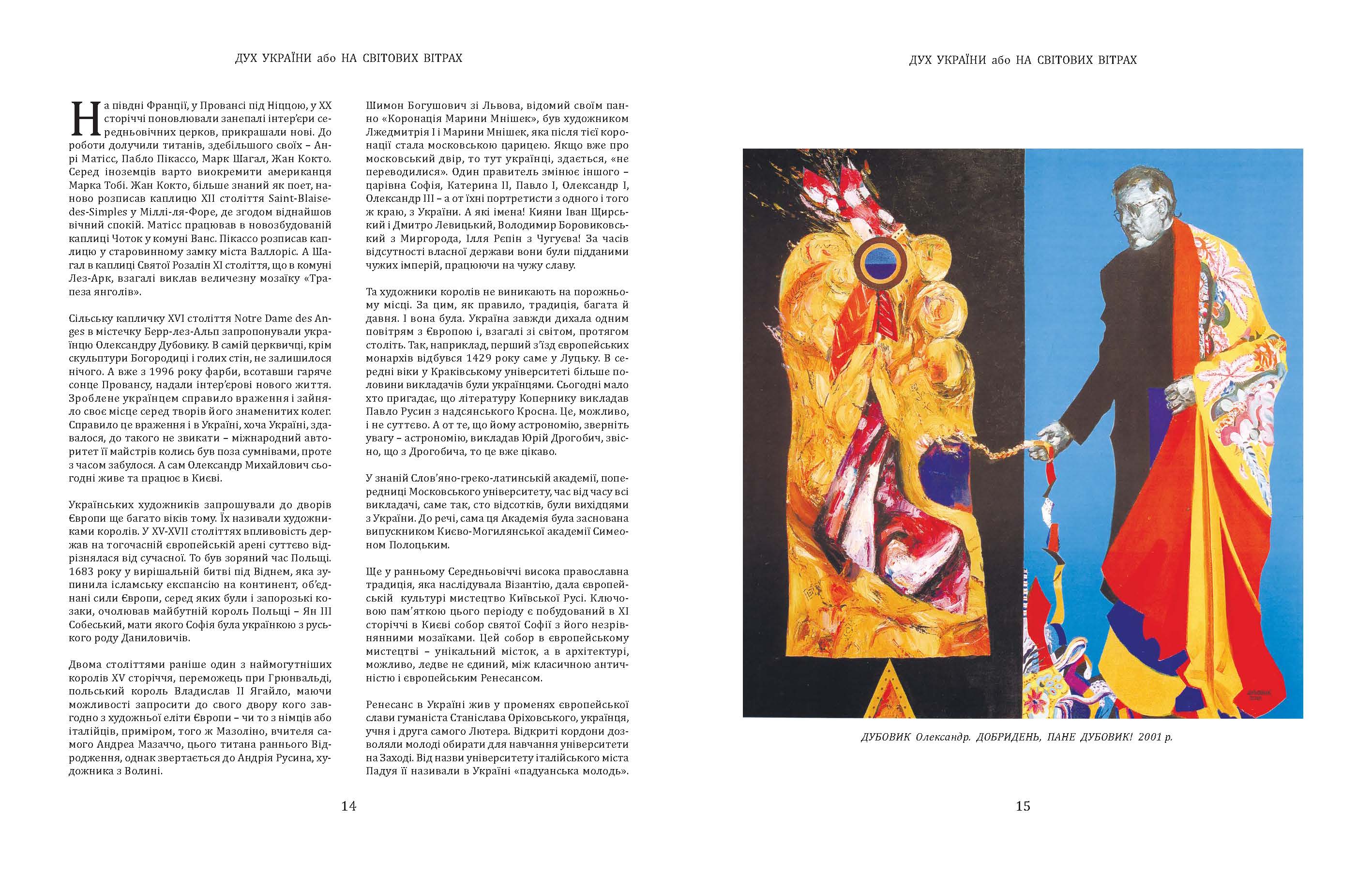 «Книга Мистецтво світу. Внесок України складається з текстів, в яких на тлі історії йдеться про події, явища, людей українського художнього світу, спадщина яких сьогодні визнана світом.