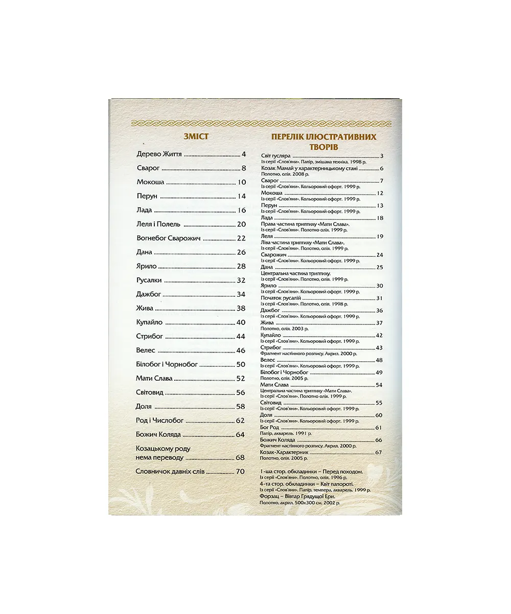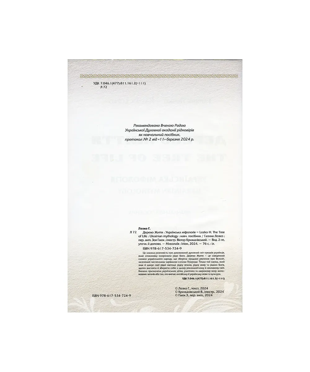 Книжка Дерево життя — про дивовижний духовний світ предків українців, споконвіку охороняли рідні Боги. Дерево Життя — це священний символ українського народу, що зберігає прадавні уявлення про Всесвіт, заселений численними силами Природи. Тільки той народ, який знає й шанує свої рідні святощі: свою рідну землю, рідні мову та рідних Богів, здатен вистояти й зберегти себе в цьому різноманітному і мінливому світі.